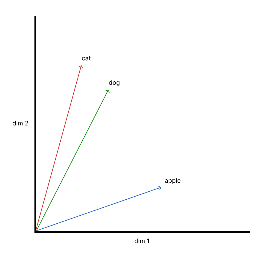 How do vectors represent the meaning of words? One intuition is that LLMs learn to create similar embedding vectors for words that have a similar meaning (e.g. the words see, look, watch). Similar vectors have a similar direction in the high-dimensional embedding space and there is a relatively small angle between them.
