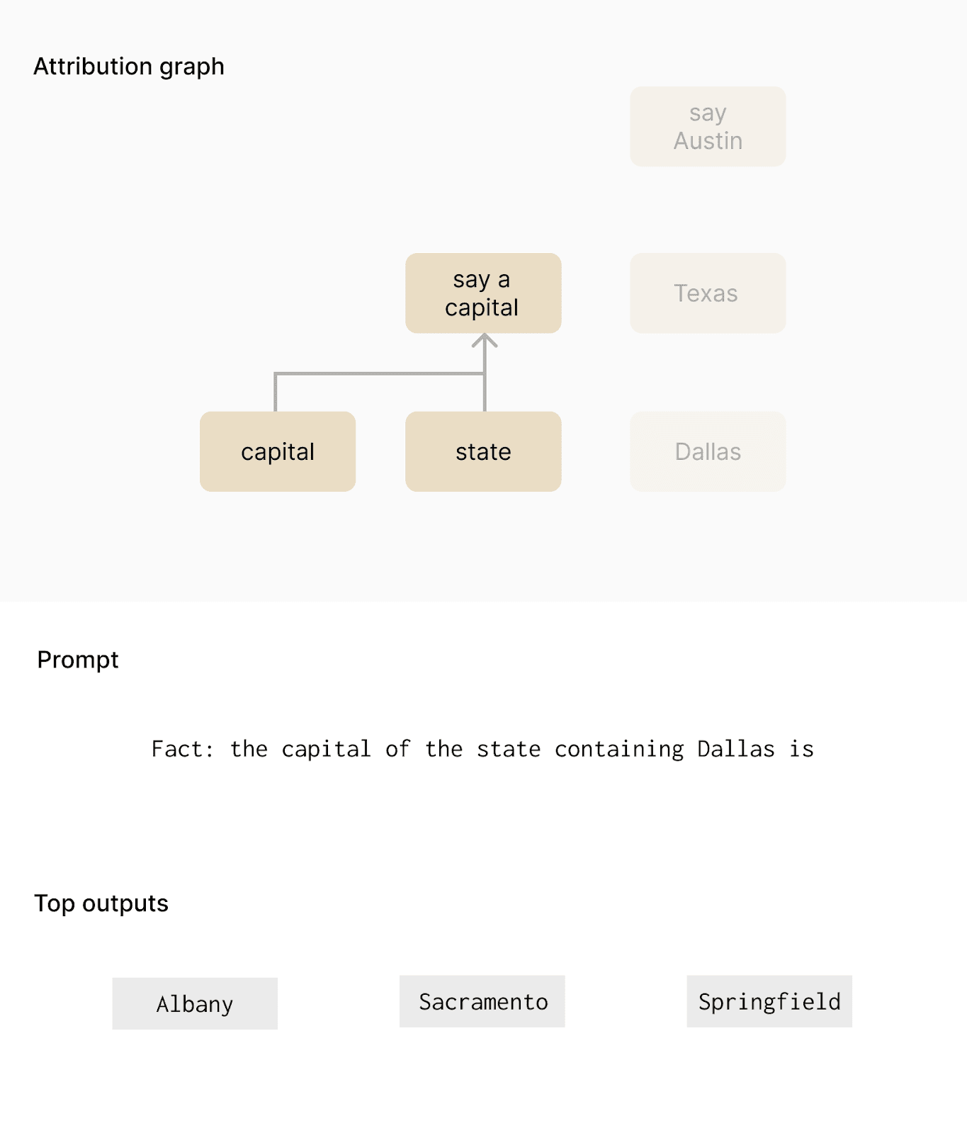 For example, in a prompt like “the capital of the state containing Dallas is,” the unmodified local replacement model correctly outputs “Austin.” The attribution graph for this behavior shows that the “capital,” “state” and “Dallas” features are activated. Suppressing the “Dallas” feature causes the model to output random US state capitals like “Albany” or “Sacramento” which confirms that the “Dallas” feature specifically causes the model to output the capital of Texas, rather than any state capital.
