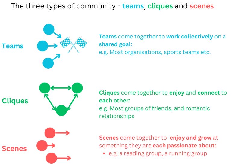 Teams require a lot of buy-in, trust, communication and a clear shared vision on what is being achieved. Scenes are usually more fluid, opt-in, and porous. You can create a scene that tries to achieve things collectively (e.g. hackathons often feel like this), but in my experience, the friends (cliques), skills, and experiences made along the way are much more valuable than the tangible output of goal-oriented scene-building.