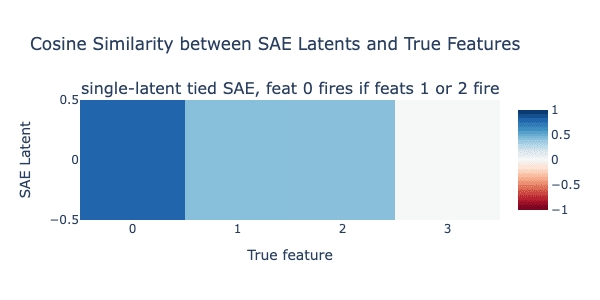 Sadly, we see our assumption is incorrect. The SAE does represent feature 0 in its single latent, but it also merges in the child features 1 and 2. Feature 3, the independent feature, is fully excluded. Interestingly, the encoder of the untied SAE is nearly identical to the decoder, so the pattern is indeed different than our original absorption pattern for untied SAEs where the encoder for a parent feature had a negative rather than positive cos sim with child features. While this is not technically absorption, this is still a broken latent.