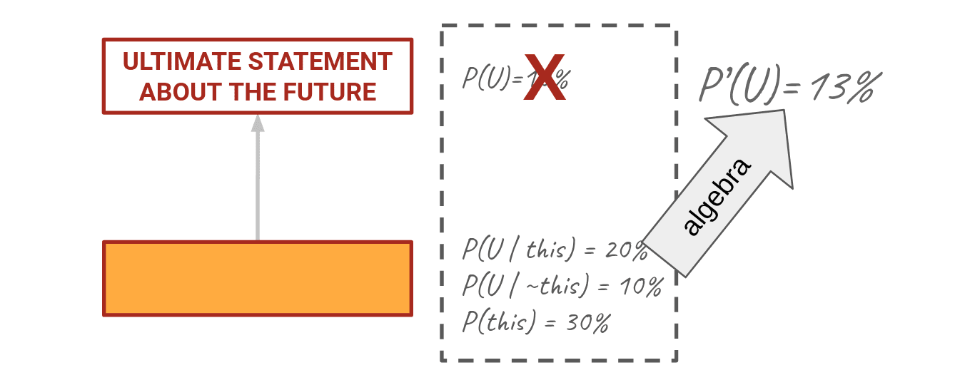 So I think about O—P(O)—and what I would think about U if I knew O was true—P(U|O)—and if I knew it was false—P(U|~O). Do a little algebra on that and you’ll find a new P(U) of 13%. Thinking about O helped me clarify what I thought about U.