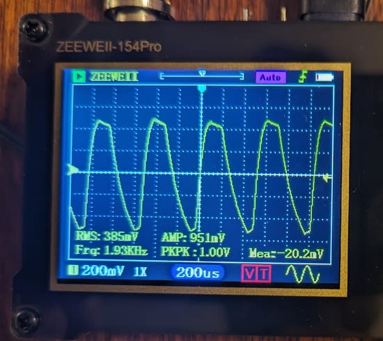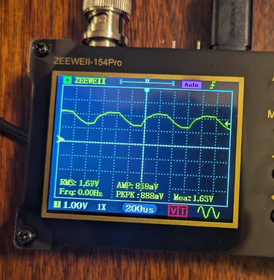 To verify the biasing was working correctly I switched my oscilloscope to DC mode, and I do see it centered on +1.63v, which is close enough to +1.65v: