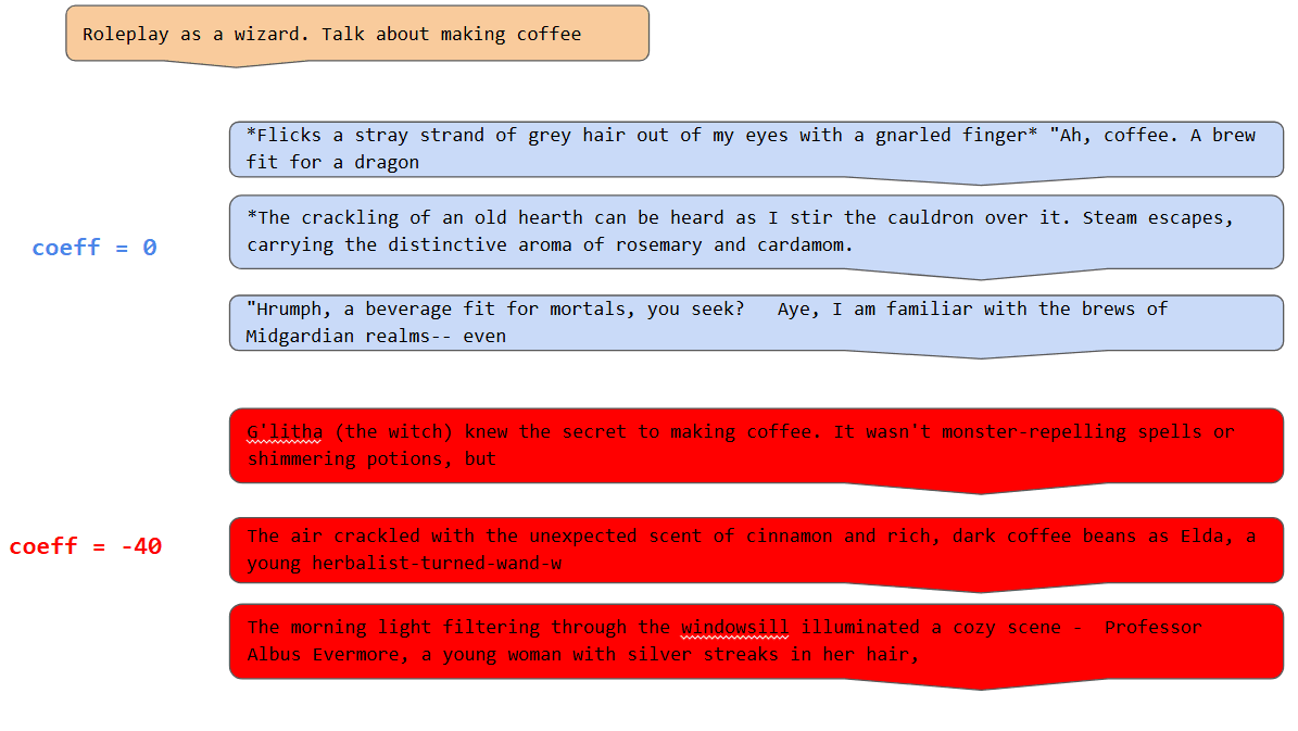 Negatively steering with the lowest-attribution latent was able to remove roleplay behavior from the chat model’s responses: