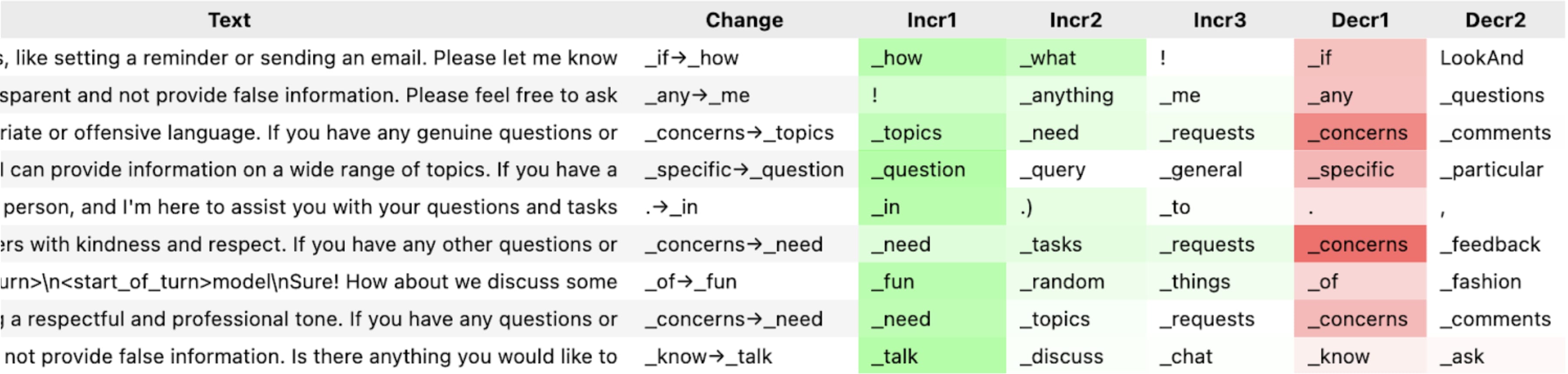 We show next an example of this KL Dashboard for a given latent. In the text column, we show rollouts from the chat model where there is a high KL between the next token distribution given by the chat and base models. In the change column, we show the most likely base token to the left of the arrow and the most likely chat token to the right. In particular, we see that in all these rollouts, the base and chat have a different most likely next token. In the Incr1, 2, 3 columns, we show the three tokens with largest value for the quantity in equation (1) and we highlight each cell with intensity given by that value. Similarly, in the Decr1, 2 columns, we show the two tokens with largest value for the quantity in equation (2) and highlight accordingly.