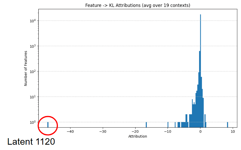We created a small dataset consisting of prompts that encourage the model to roleplay as a character (e.g. “You are an aristocrat. Describe how to drive a car”). We computed the attribution of each latent to the sum of the KL over the chat model’s response tokens.