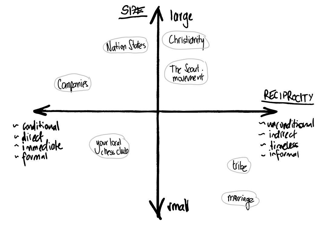 To clarify further what we do and don’t mean by tribes, let’s consider two axes along which we can categorize different types of social groups: size and logic of reciprocity.