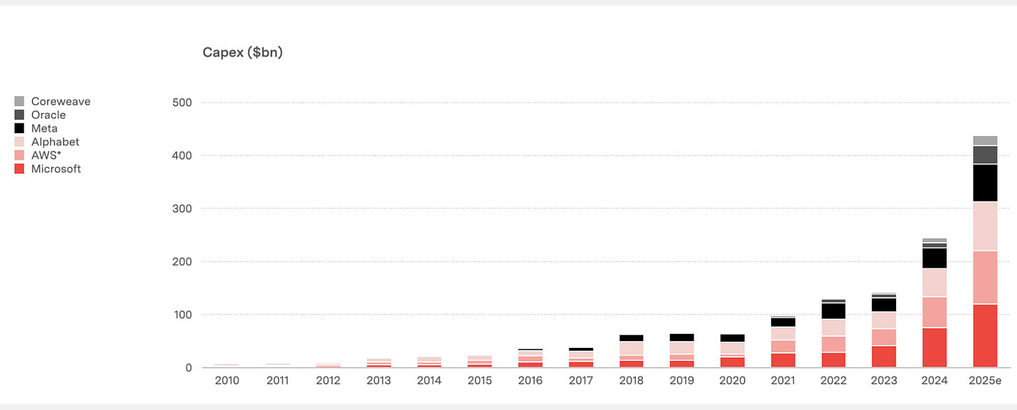 As a result, older GPUs rapidly drop in price (see below). The per-hour GPU rental price of the A100, released in 2020, is a fraction of the recently released Blackwell (B200). So, while the contribution margin of the A100 is high, the rapid decline in price / hour means that IRR ends up looking unattractive. Furthermore, a material portion of the inference compute online now is from the 2020-2023 era, when capex was in the ~$50-100B scale. Now that we’re doing $400-600B a year in capex, there is real risk that Mr. Market is overbuilding.