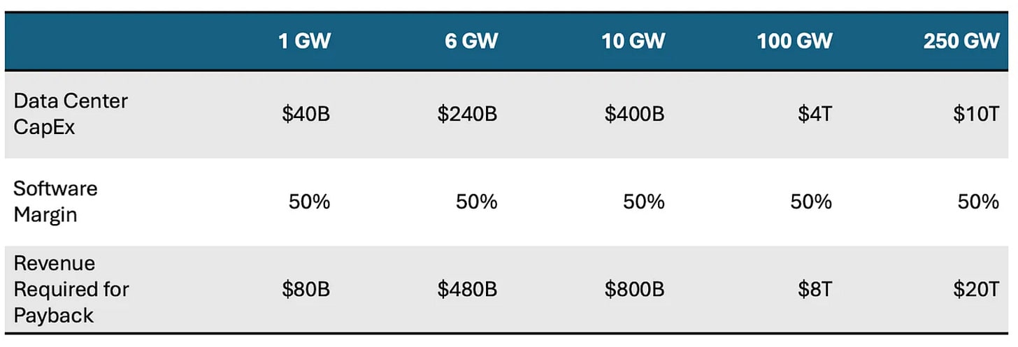 Based on the calculations above, we’d need to fill a $1.5T revenue hole by 2028! To put things in perspective, the global SaaS market in 2024 was only ~$400B. The bet at this point is that broad swathes of white collar work will be automated. Even if OpenAI and Anthropic hit their projections in 2028 ($100B for OpenAI, $70B for Anthropic) and AI software collectively generates an additional ~$300B in revenues, we’re still $1T short! Said another way, if AI revenues are ~$50B now, we’d need to grow AI revenues by ~30x by 2028!