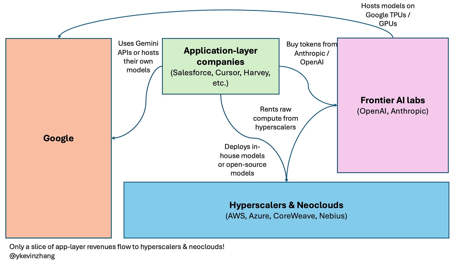 App-layer companies need a way to deploy their AI features, and can use models from AI labs or train their own models / use open-source ones (Airbnb uses Alibaba’s Qwen). They deploy their models on hyperscalers & neoclouds
