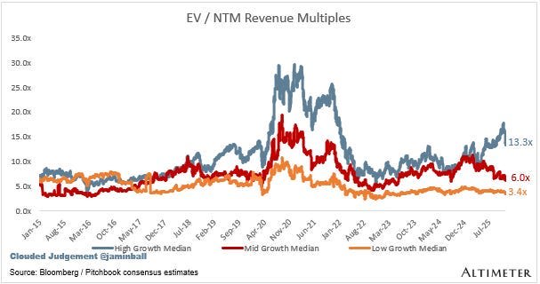 As a result, even companies with strong growth rates, like Figma, have seen their stock price collapse. The revenue multiples for the vast majority of public software startups have now retreated to their historical medians (see below). One of the few counterexamples is Palantir, which is trading at higher multiples than OpenAI! My view is that investors are conflating two things: the threat of AI, and the natural saturation of SaaS (the plateauing of growth as certain categories of SaaS reach peak market penetration).