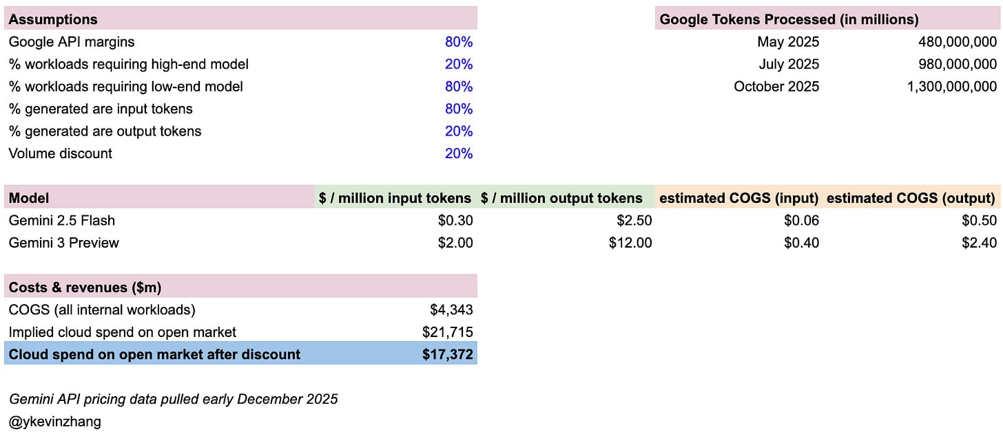This results in $17B in cloud revenues from serving AI across Google’s entire product surface, and is likely an overestimation because a portion of these “tokens processed” comes from things like the Gemini API / chatbot (so it’s already accounted for on Alphabet’s income statement).