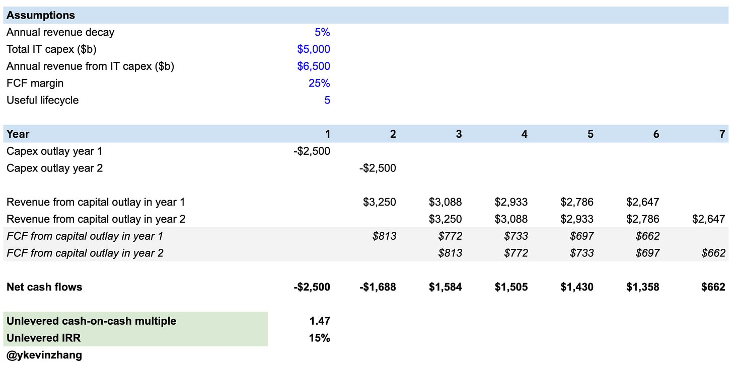 Our hypothetical model shows that we get a reasonably attractive ~15% unlevered IRR and ~1.5x cash-on-cash returns. Hyperscalers can juice these returns with leverage given their access to cheap debt. Another thing to note here is that cashflows “pay back” capex as well as other ancillary costs (e.g. R&D, etc.) in ~3 years, and FCF from the “out years” are pure profit.
