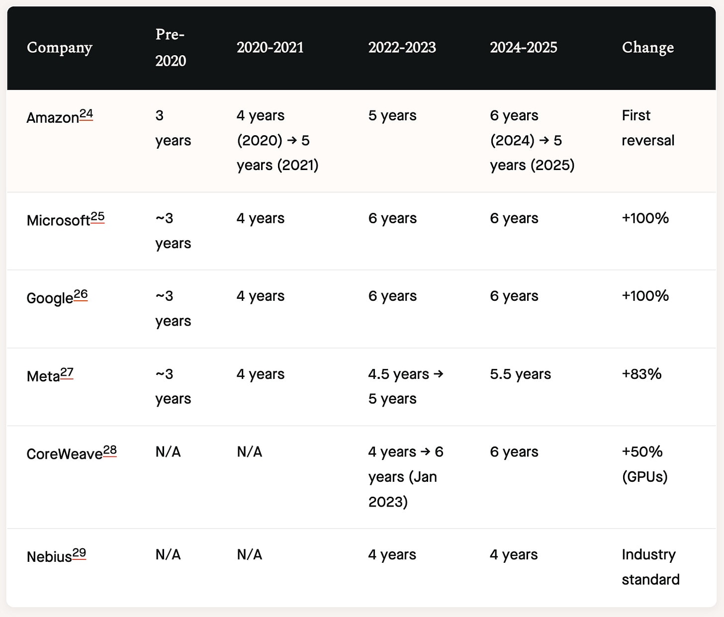 The other risk is the unrealistic depreciation schedules of AI hardware. Most cloud vendors now depreciate their equipment over 6 years instead of 4 or 5. This made sense in the old regime when there wasn’t a real need to replace CPUs or networking equipment every 4 years. In the AI era, 6 years means 3 major generations of Nvidia GPUs! If Nvidia maintains its current pace of improvements and more supply comes online, then serving compute from older GPUs might well become uneconomical, which is why clouds push for long-duration contracts.