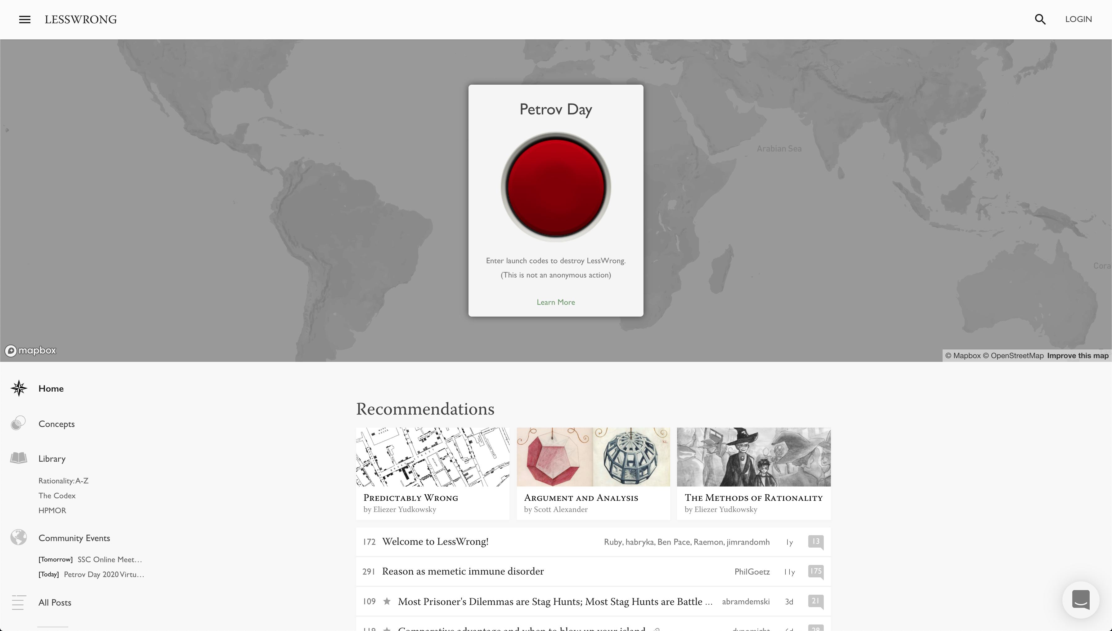 In the meantime I’m happy to confirm any basic facts. Indeed, user Chris_Leong submitted his unique launch codes at 4:33am Pacific Time, bringing down the LessWrong Frontpage for 24 hours.