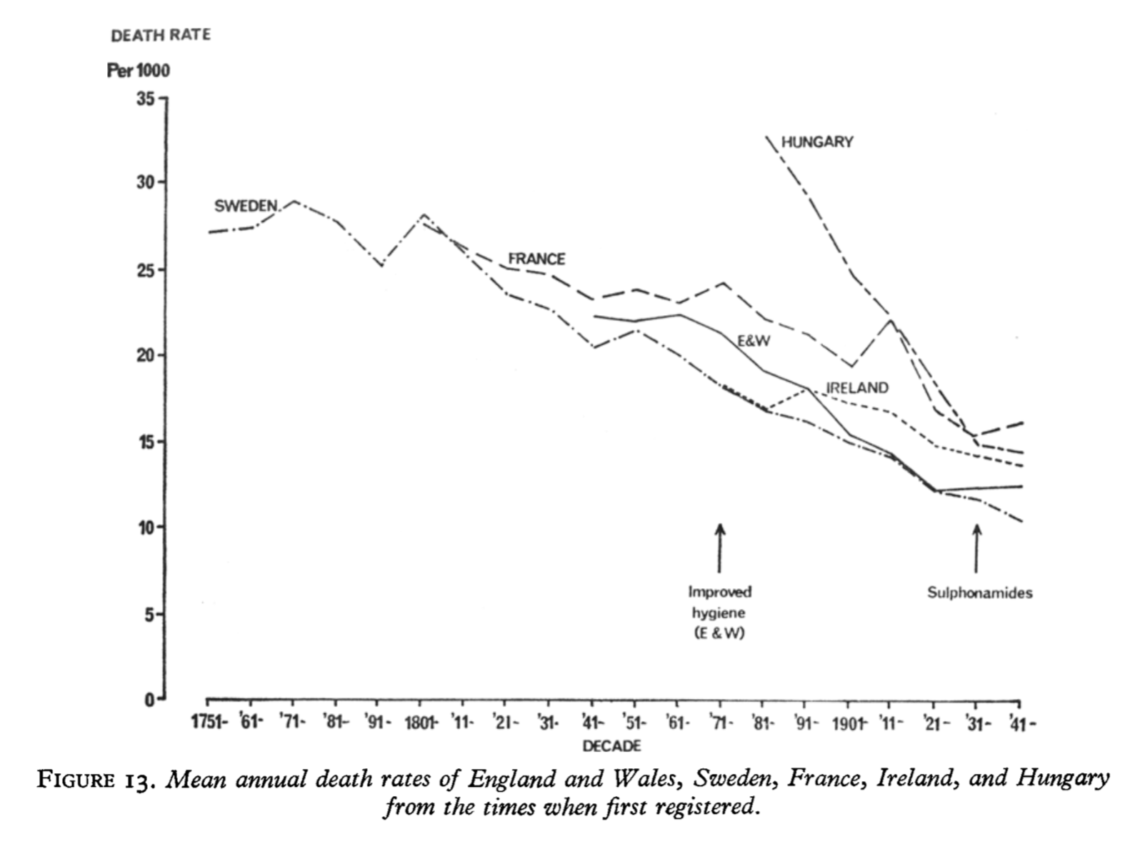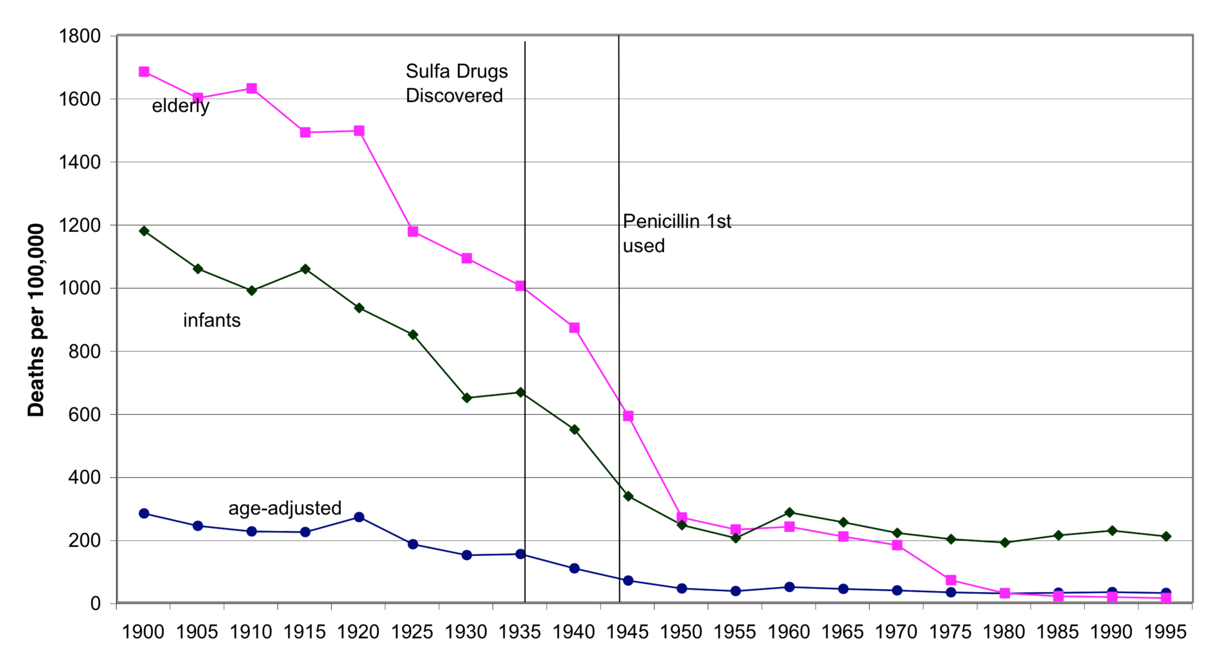 Just based on this timing, it’s not unreasonable to estimate that antibiotics alone were responsible for a decrease in the mortality rate of something like 5.4%/year for 15 years, or an overall reduction of over 56%.