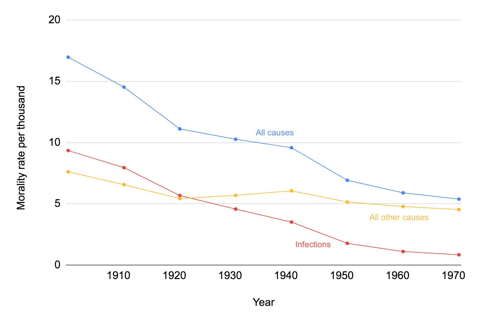 So I started looking into the data and interpretations of it. And the surprising thing I found is that infectious disease mortality rates have been declining steadily since long before vaccines or antibiotics.