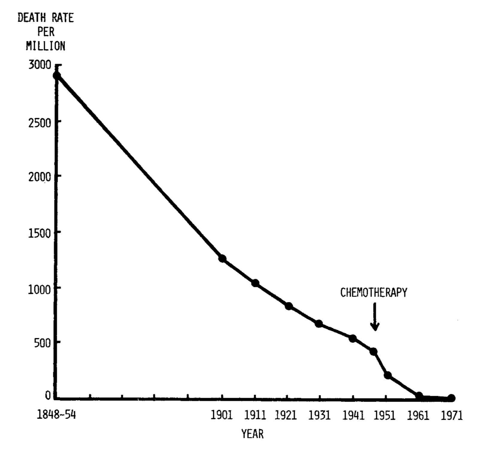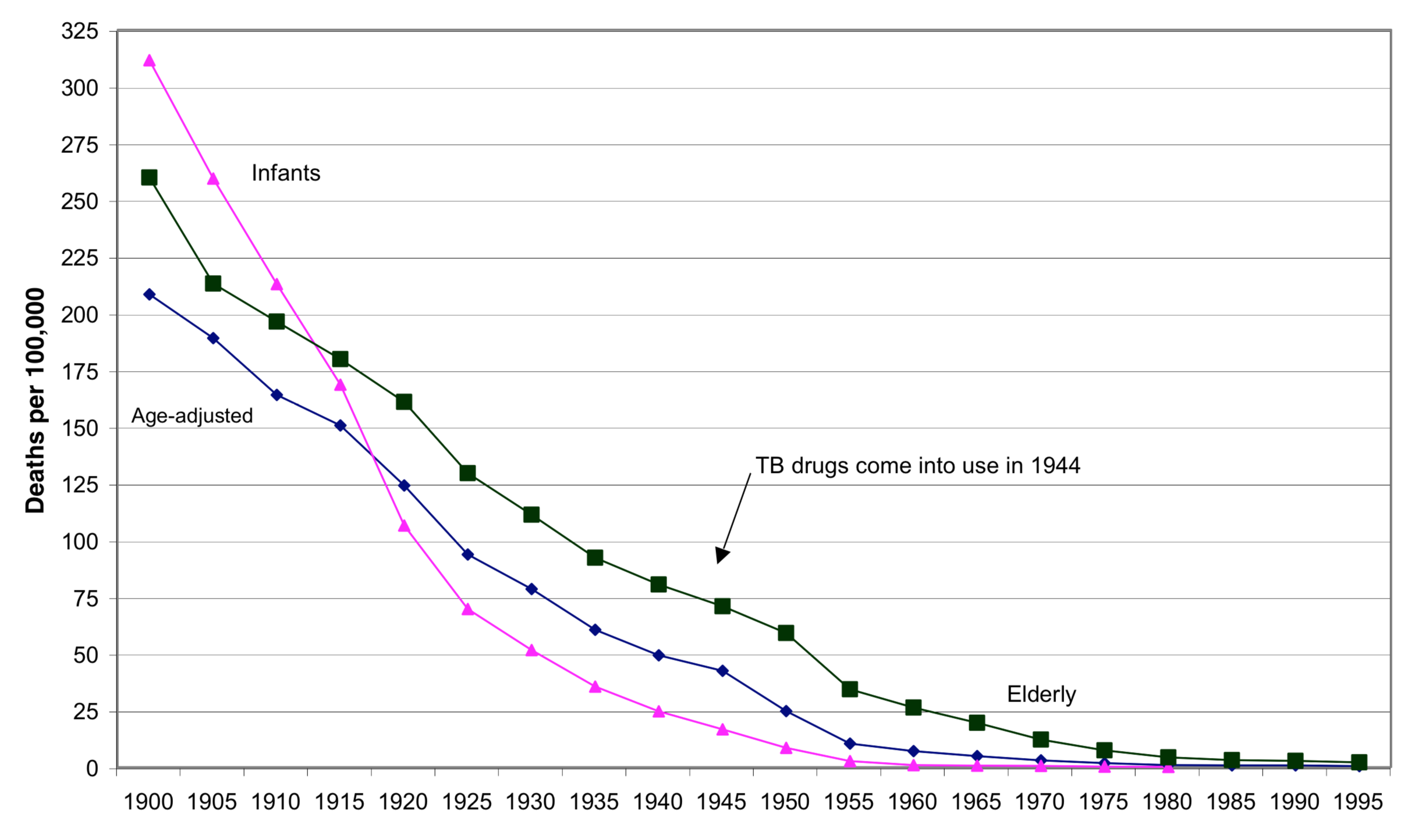 The role of some major factor other than medical treatment is even more clear if you break out the mortality rates by specific diseases. In 1900, the most deaths came from tuberculosis, influenza/pneumonia, and gastroenteric diseases such as dysentery. [1][4][5] All of these were effectively conquered by antibiotics in the 1930s and ’40s, but were on the decline since at least the beginning of the century. Some charts that illustrate this in the US: [4]