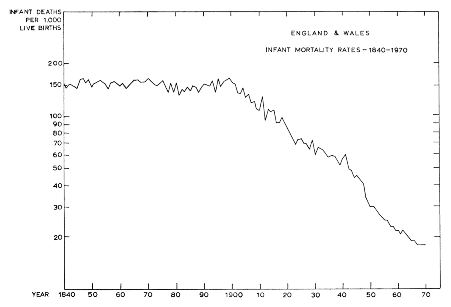 Food handling improved as well. Milk is a case in point: In England, as of the late 1800s, milk was transported warm in open containers, making it a literal breeding ground for tuberculosis and other bacterial diseases. Pasteurization was introduced around 1900, along with sealed tins and bottles for transporting and storing milk. Condensed and evaporated milk also became popular around this time, and since these products were sterile they also reduced diseases. All these innovations contributed to the rapid decline in infant mortality seen here: [11]