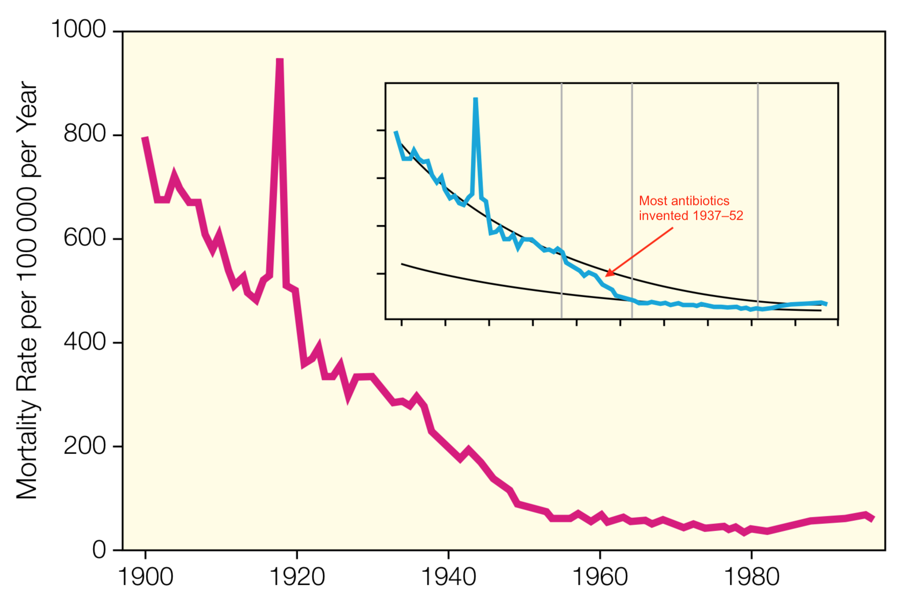 However, it also shows the extreme effectiveness of antibiotics, when they were finally invented. In the US, during the golden age of antibiotics from 1937 to ’52, the infectious disease mortality rate fell by 8.2%/year, compared to an average of 2.8%/year during 1900–36 and 2.3%/year during 1953–80. [1] The inset in the following chart illustrates this by overlaying two exponential curves representing the two slower declines before and after; the antibiotics era is in between, where the blue line rapidly falls from the higher curve to the lower:
