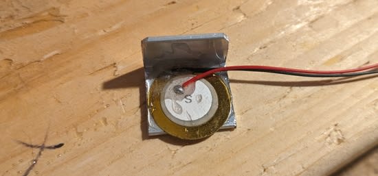 The cross section is an ‘L’, 3/4“ on one side and 1/2” on the other. I used a hacksaw to cut it down to the width of one of my piezo discs, and filed the rough bits and sharp corners. I epoxied the disc onto the angle, and put extra epoxy on top to protect the solder joints: