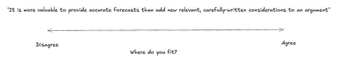 Neither of these are a clear track record for me. I chatted to Oliver Habryka and he said “I think contributing considerations is usually much more valuable than making predictions.” As I understand it , he sees getting top contributors to build forecasting track records as less useful compared to careful writing and the reading of such writing. I see forecasting as a useful focus and a clearer way of ranking individuals.