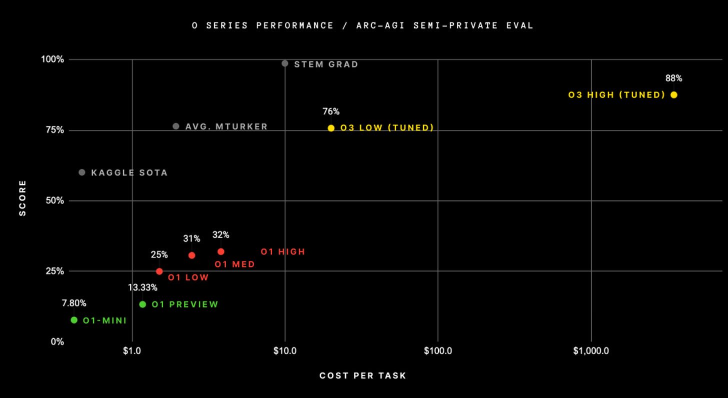 o3 also approaches human performance on the ARC-AGI benchmark, which was designed to be hard for AI systems, but relatively doable for humans (i.e. you don’t need a PhD to get decent scores). However, it’s expensive to get those scores.