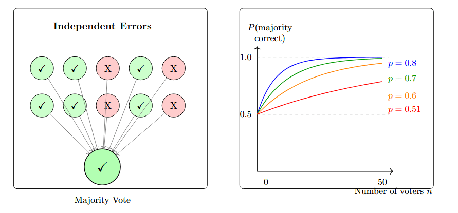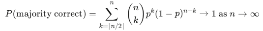 Condorcet’s Jury Theorem — first articulated in his 1785 treatise — says that if you have n voters, each with probability p > 0.5 of being correct, and their errors are independent, then as n increases, the probability that the majority is correct approaches 1: