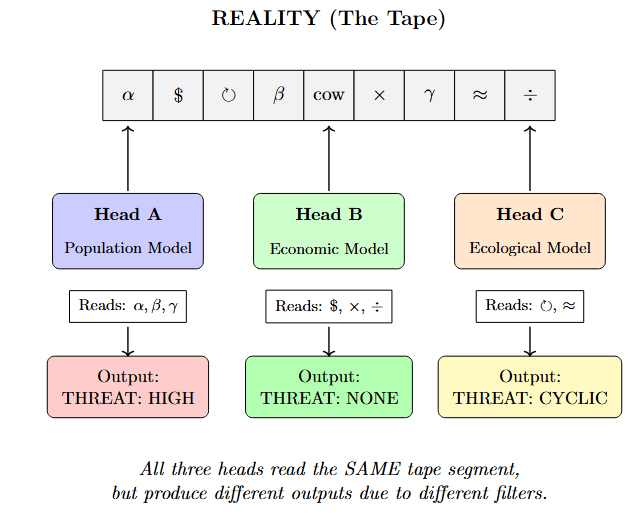 We can formalize this if we think about Turing machines — tape readers that process inputs according to rules encoded in their heads. There’s deep stuff connecting Bayesian learning and computation here. Different machines read different types of things. You can take an economic perspective, an ecological model, a population model. Each one processes reality through a different set of primitives.