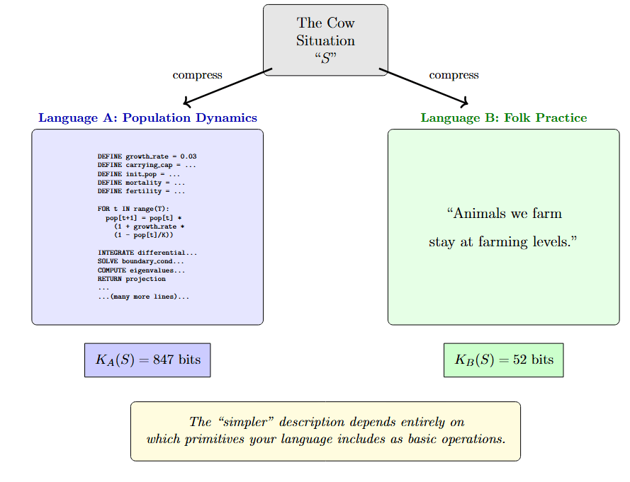 In the population dynamics language, the cow situation requires an elaborate program — growth rates, carrying capacity, differential equations, eigenvalue computation. K_A(S) = 847 bits. In the folk practice language, the same situation compresses to a single sentence: “Animals we farm stay at farming levels.” K_B(S) = 52 bits (fully calculated numbers, trust me.). The “simpler” description depends entirely on which primitives your language treats as basic operations.