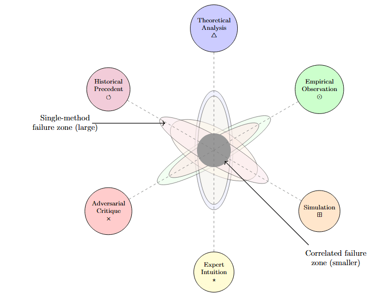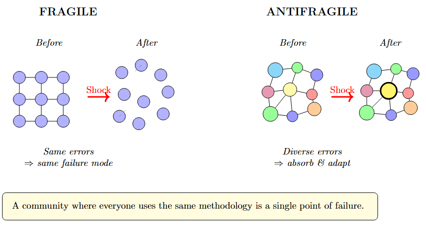 Epistemic communities work the same way. A field where everyone uses the same methodology is fragile — if the methodology has a blind spot, everyone shares it. A field with diverse methodologies is more robust — different approaches serve as error-correctors for each other.