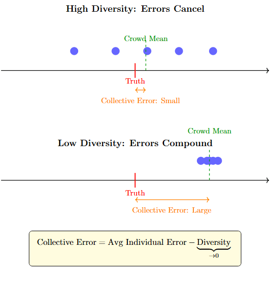 If prediction diversity goes to zero — if everyone predicts the same thing — then collective error equals average individual error. The wisdom of crowds term has dropped out entirely. You’ve paid the costs of consulting many people (time, coordination, the appearance of epistemic humility) and received none of the benefits. You might as well have asked one person and saved yourself the trouble. The herd moves as one, which looks like wisdom until you notice they’re all walking toward the same cliff, lowing in agreement.