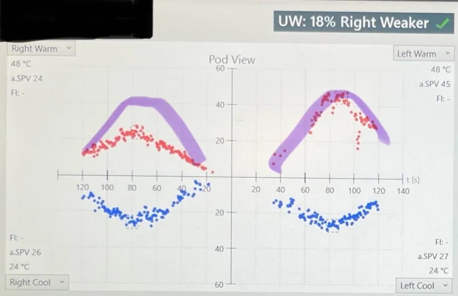 [ Best photo I have left of my VNG results, from June of 2024. The red scatterplots show my labyrinths’ response to warm water, blue cold. The purple highlights [ drawn by me after the tester’s description ] show where my vestibular heat reflex should be; the red parts of the scatterplot show that at the time my left oculomotor reflex was OK but my right was deficient. ]