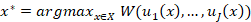 Suppose there is a set of “attainable” states of the Word X. Naive cardinal utilitarianism suggest that given an aggregation function W(.) -often simply a sum- and J members of the society each with a (possibly different) utility cardinal function on the states of the World, the social optimum is simply the point (attainable state of the world) that maximizes aggregate utility: