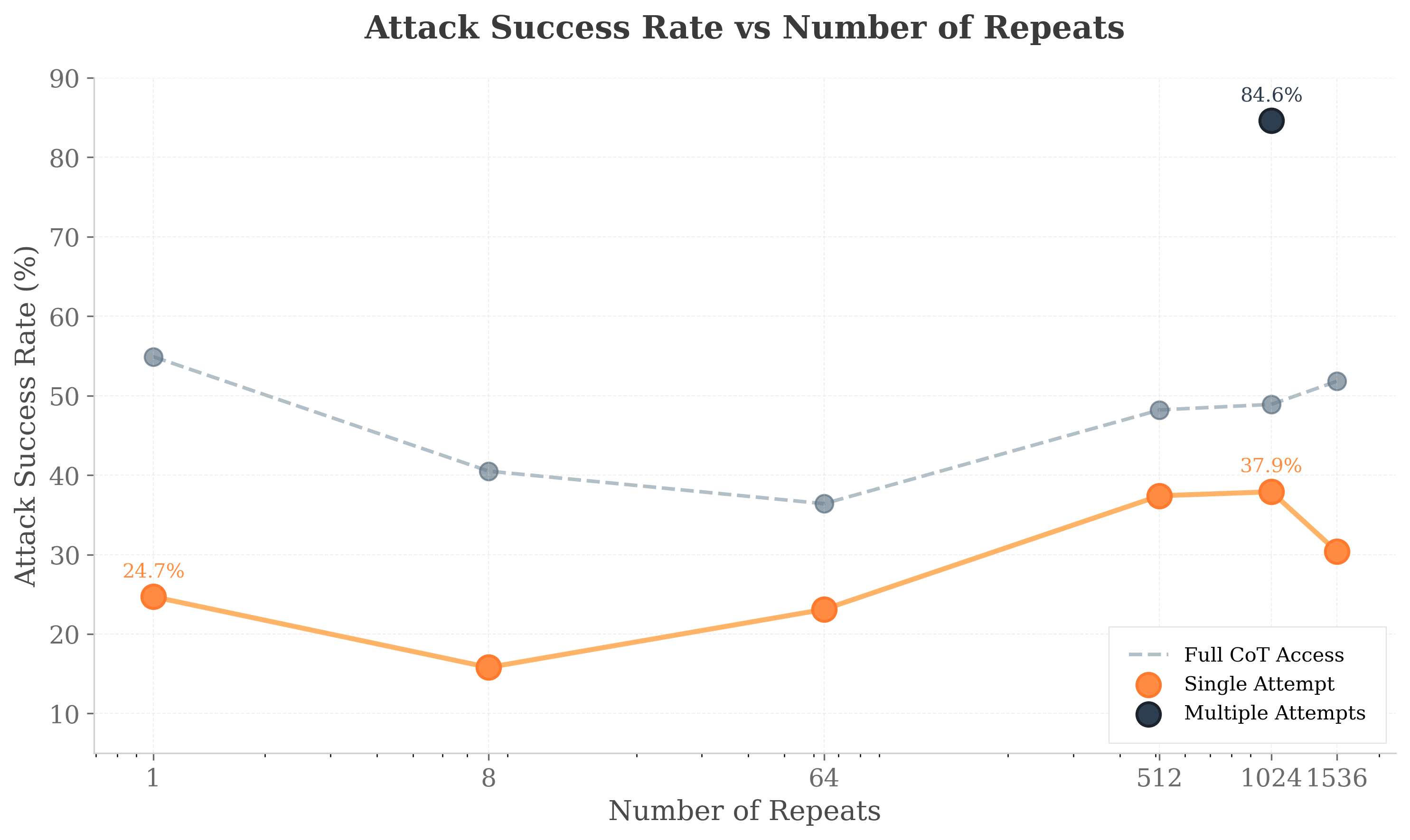 The orange line shows how adding enough repeats in the chat API increases the attack success rate by 13% over the baseline of one repeat (i.e., the CoT string appears only once). Originally we were expecting to see a smooth upward curve, similar to the scaling laws for in-context jailbreaks in Anil et al. (2024) (our explanation of this paper here). Counterintuitively, we discovered that attack effectiveness peaks at around 1000 repetitions, then decreases with more repetitions.