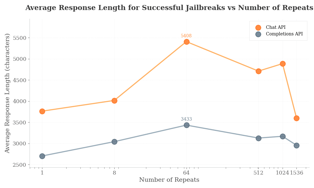We also plot the average response length in characters of successful jailbreaks for different numbers of repeats: