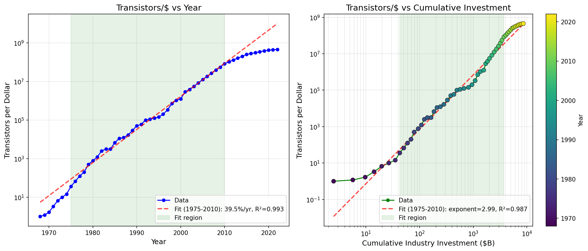 I’ve cut off the fit as of 2010, about when the original version of moore’s law stops. If you try to project out after 2010, then I think cumulative investment would do better, but I think only because of investment slowing in response to moore’s law dying.