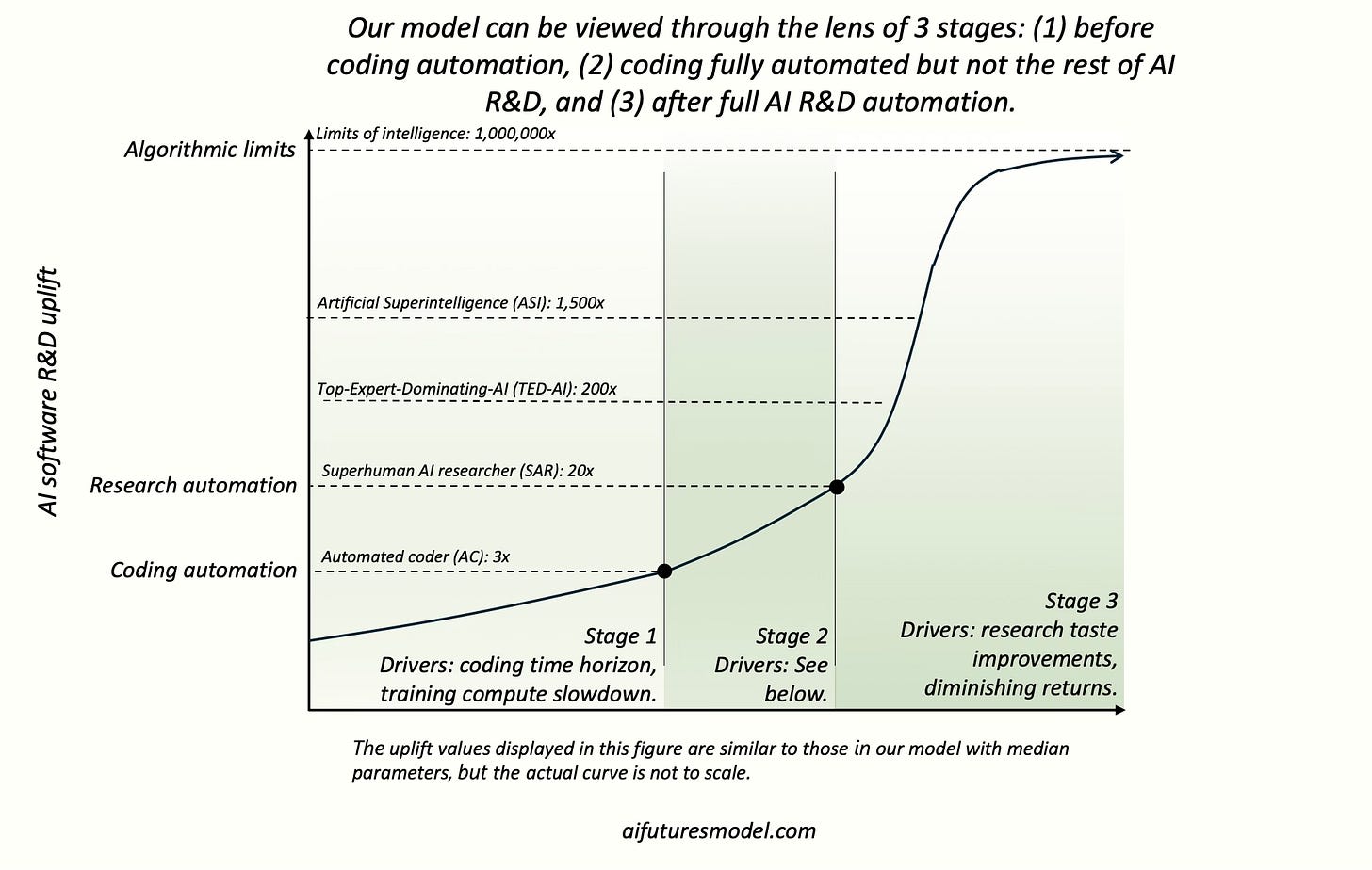 Our model can intuitively be divided into 3 stages. Although the same formulas are used in Stages 1, 2, and 3, new dynamics emerge at certain milestones (Automated Coder, Superhuman AI Researcher), and so these milestones delineate natural stages.