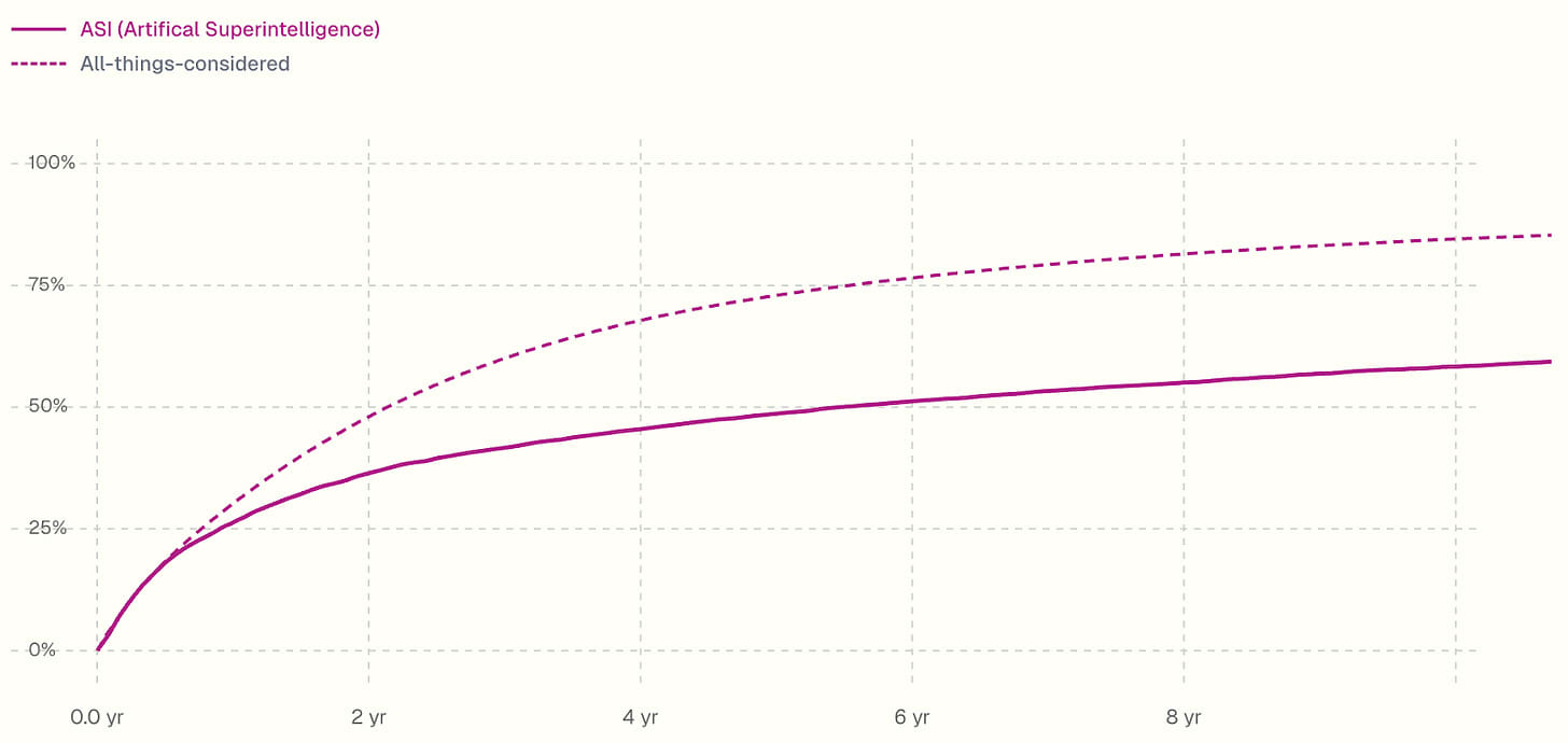 To get my all-things-considered views I: increase the chance of fast takeoff a little (I change AC to ASI in <1 year from 26% to 30%), and further increase the chance of <3 year takeoffs year takeoffs (I change the chance of AC to ASI in <3 years from 43% to 60%).