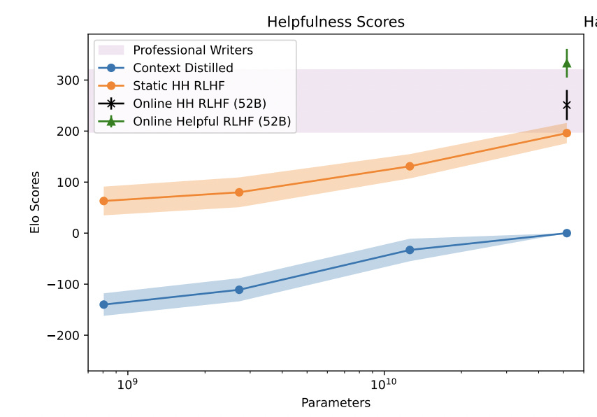 From Figure 1 of source. The green triangle is just outside the “Professional Writer” region. That point represents the set-up where the model was explicitly fine-tuned to be helpful, neglecting harmlessness.
