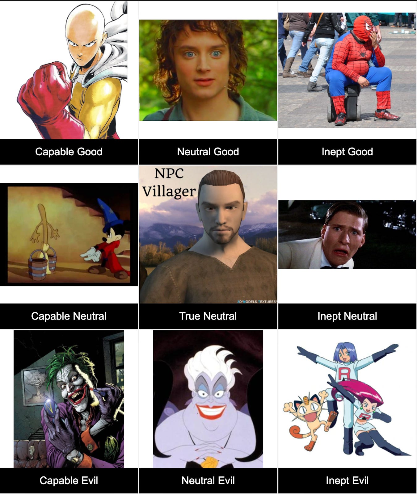 The orthogonality thesis is an idea we are very familiar with from pop culture. Fictional characters can be heroes or villains, and they can be capable or inept. Have a look at this alignment chart that took me way too long to make: