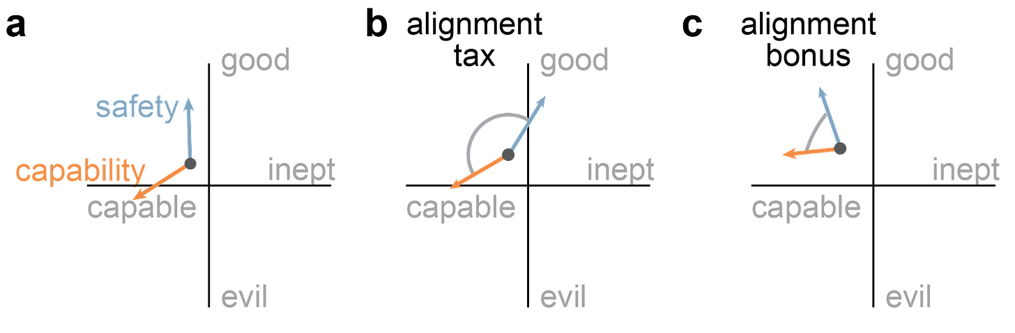 • how an alignment tax might come about; at some point, we might have to decide between pushing more in the “capable” or the “good” direction, and there might be hard trade-offs between the two.