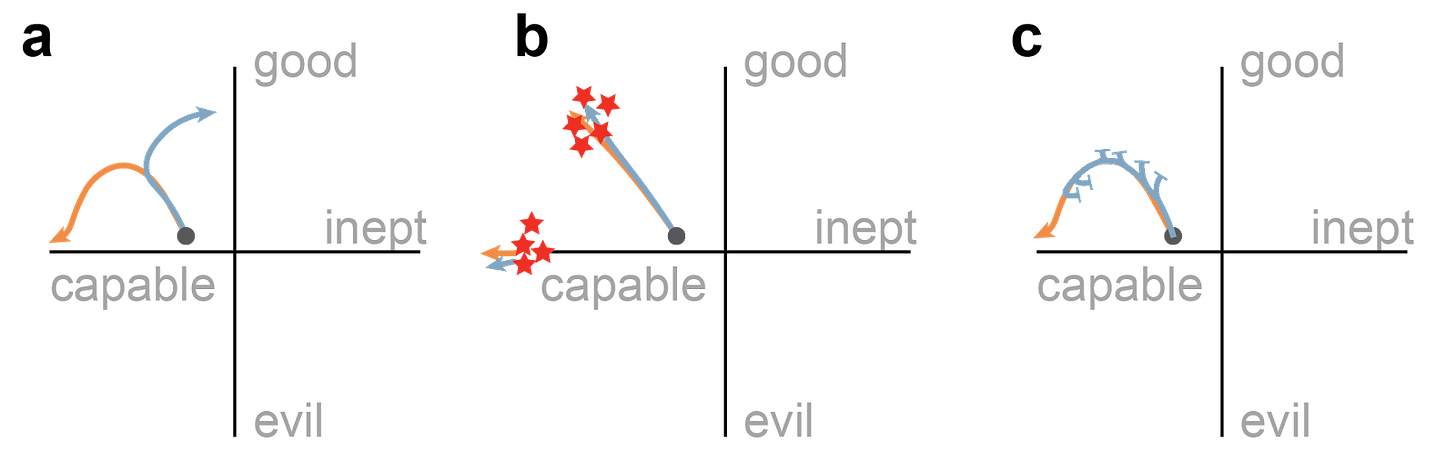That’s a fair point[13], but still, something is going on, and we need some terminology. I think about it this way: remember the orthogonality thesis from the beginning. Agents can vary along the two axes “good <-> evil” and “capable <-> inept”. When we think of the abstract space of AI techniques, the current state-of-the-art is a point in that space. Each innovation translates into moving the state-of-the-art in some direction. At each time, we choose between pushing for innovation in the “safety” or the “capability” direction.