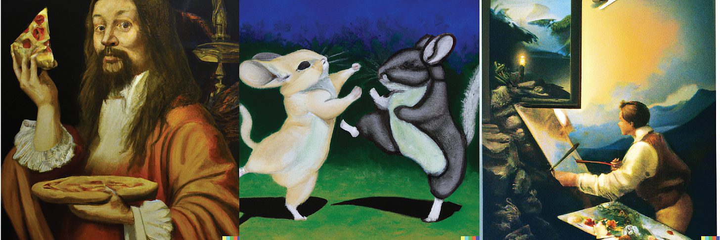 Three images created by me with OpenAI’s DALL-E 2. The prompts are: “A painting of Leonardo Da Vinci holding a slice of pizza.”, “A painting of a chinchilla and a gopher dancing.”, “A painting of a painting of a painting of a painting.”