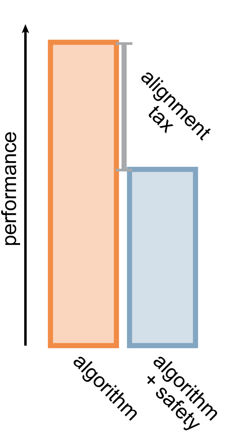 Schematic of the alignment tax. The label on the y-axis is debatable. The tax can not only be paid in performance but also in development time or system complexity (in which case the relationship reverses).