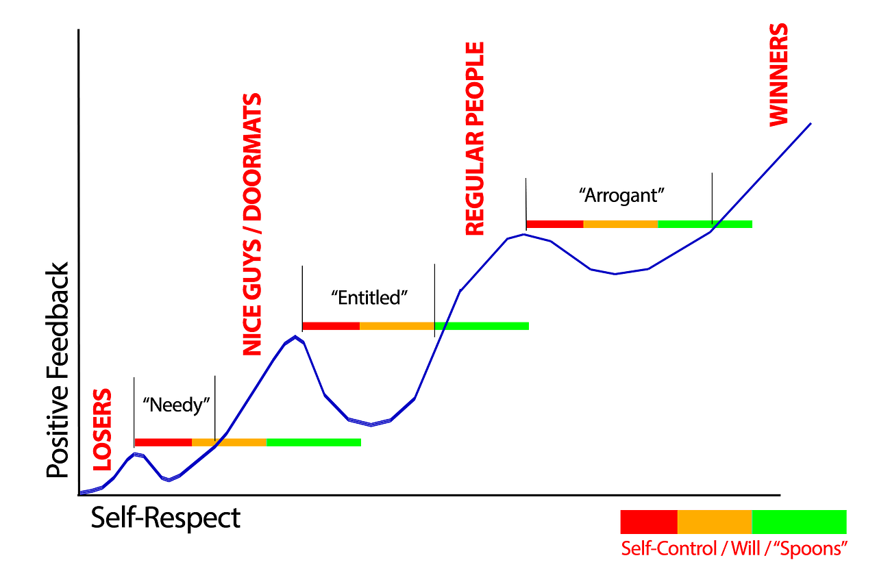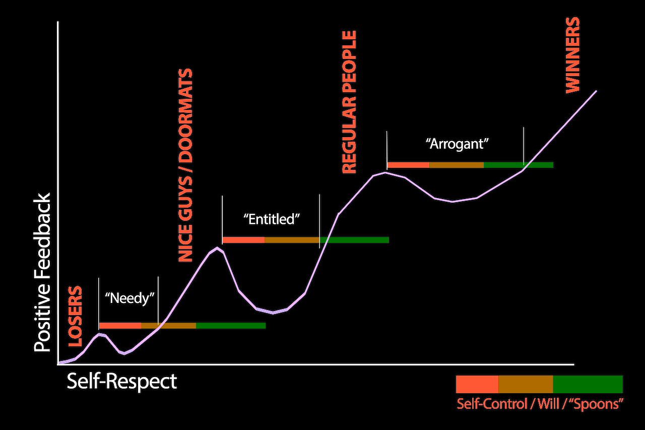 BUT, each of these “pushbacks” is a temporary dip in the “self-respect to positive feedback” curve. You just have to have enough self-control, or willpower, or “grit”, or “spoons”, or whatever, to keep pushing through and powering more and more self-respect while people attack you for having it, until you break through into the next upswing of the curve.