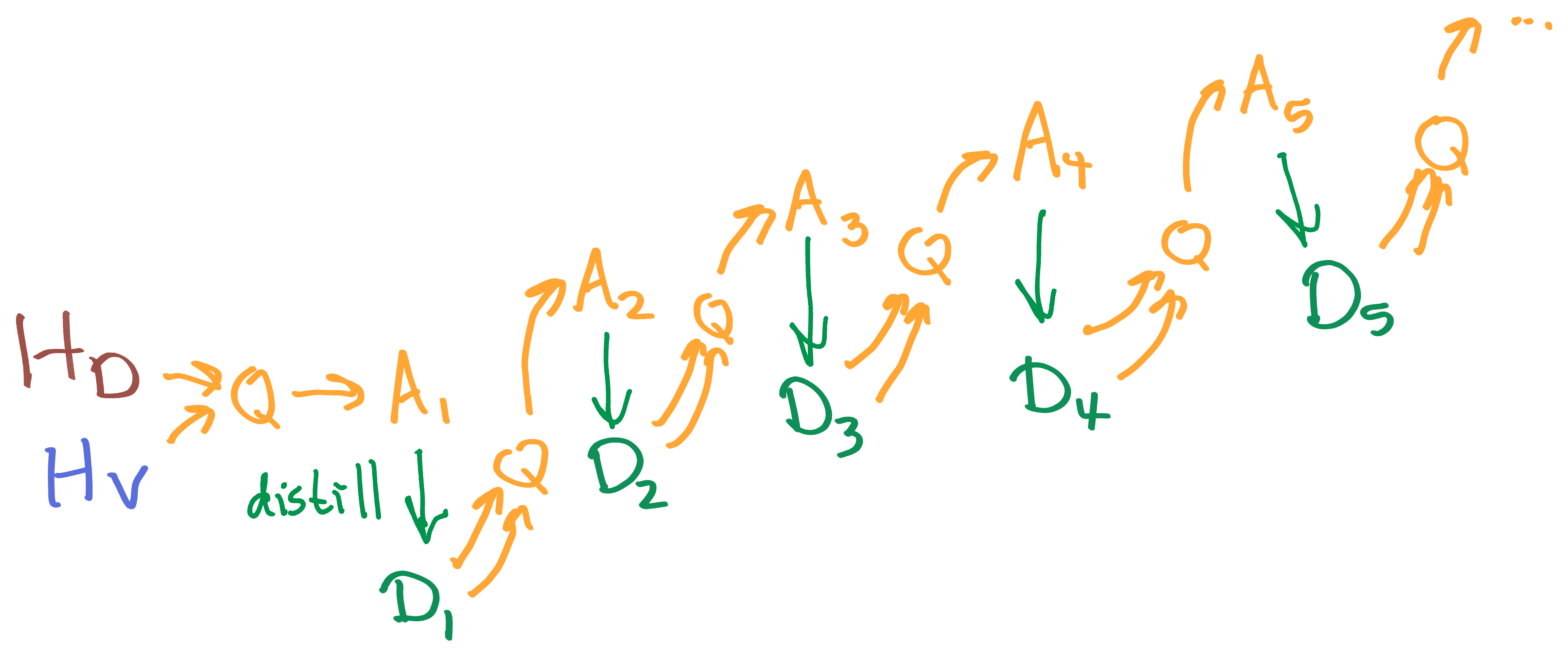 The distribution D1 is the distillation of A1; ie, we learn a more computationally efficient approximation of the distribution A1 using some distribution-modeling technique such as GANs.