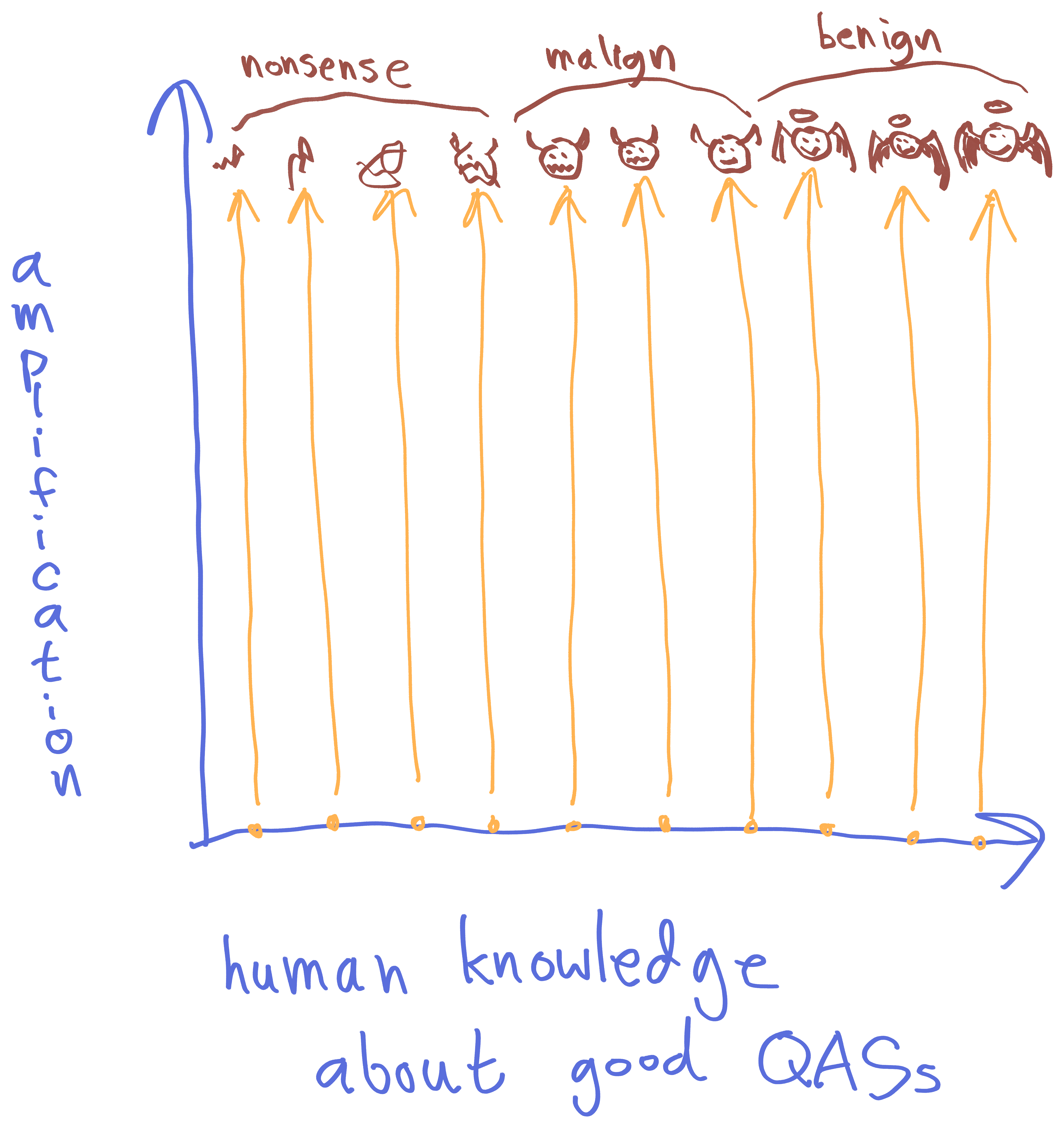 If we start amplifying something with very little human-input knowledge, we’re likely to get total nonsense out; the QASs just don’t know enough to optimize any coherent thing over successive amplification steps. If we start with a moderate amount of knowledge, the QASs might sputter into nonsense, or might get on the right track, but also have a high risk of producing highly-capable but malign agents. At some level of sufficient human input, we fall into the “basin of corrigibility” and get aligned outputs no matter what (perhaps even the same exact benign output).