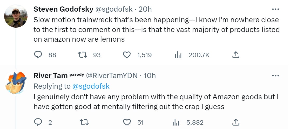 My experience has been like River’s. If you go looking for the cheapest thing listed and don’t otherwise filter, you’re going to select for a lot of shoddy or fake goods. Don’t do that. It’s unfortunate you can no longer play in easy mode and save the maximum. To do that you need to do more work and pay attention. There is however an effective easy mode, which is to use Amazon’s Choice. That’s like buying insurance.