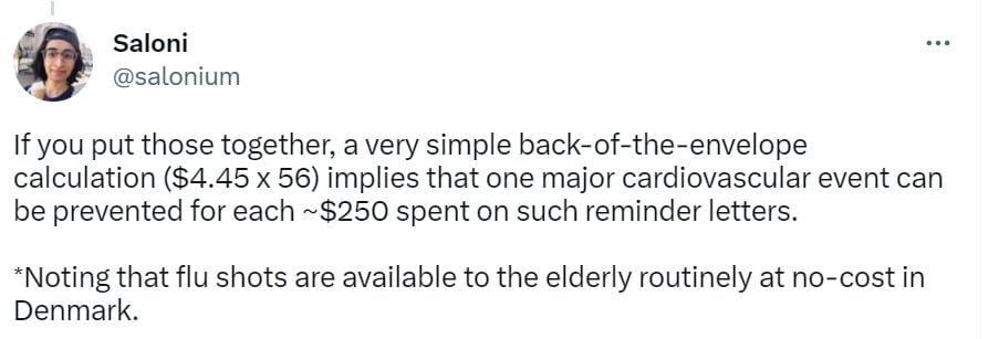 It is highly plausible that these letters are great. This still seems like the wrong calculation. If you want to measure the costs and benefits, you need to include costs other than mailing the letter. Who do we think pays for the flu shot? Presumably the state of Denmark. The patient not paying does not mean that it is free. The time spent getting the shot, and the expenses of creating, distributing and administering the shot, are very real. Similarly, the social cost of mailing someone a letter is primarily that they have to spend time to process the letter, rather than the cost of mail.