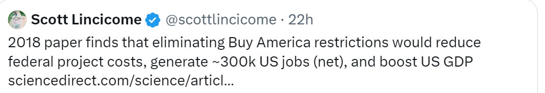 American-only requirements sound too good as political messages for politicians to pass up. If you know anything about economics or business they appear quite bad. They are so much worse than they first appear. It’s so much worse than a gigantic tax. This type of rule doesn’t have a buyout price attached. If there is some input or component that you can’t source here, or can’t get proper approvals to get made here, even some little $10 thing, there is no escape. If you accidentally use something with any component that does not qualify, you are forced to rip the thing out no matter how expensive.
